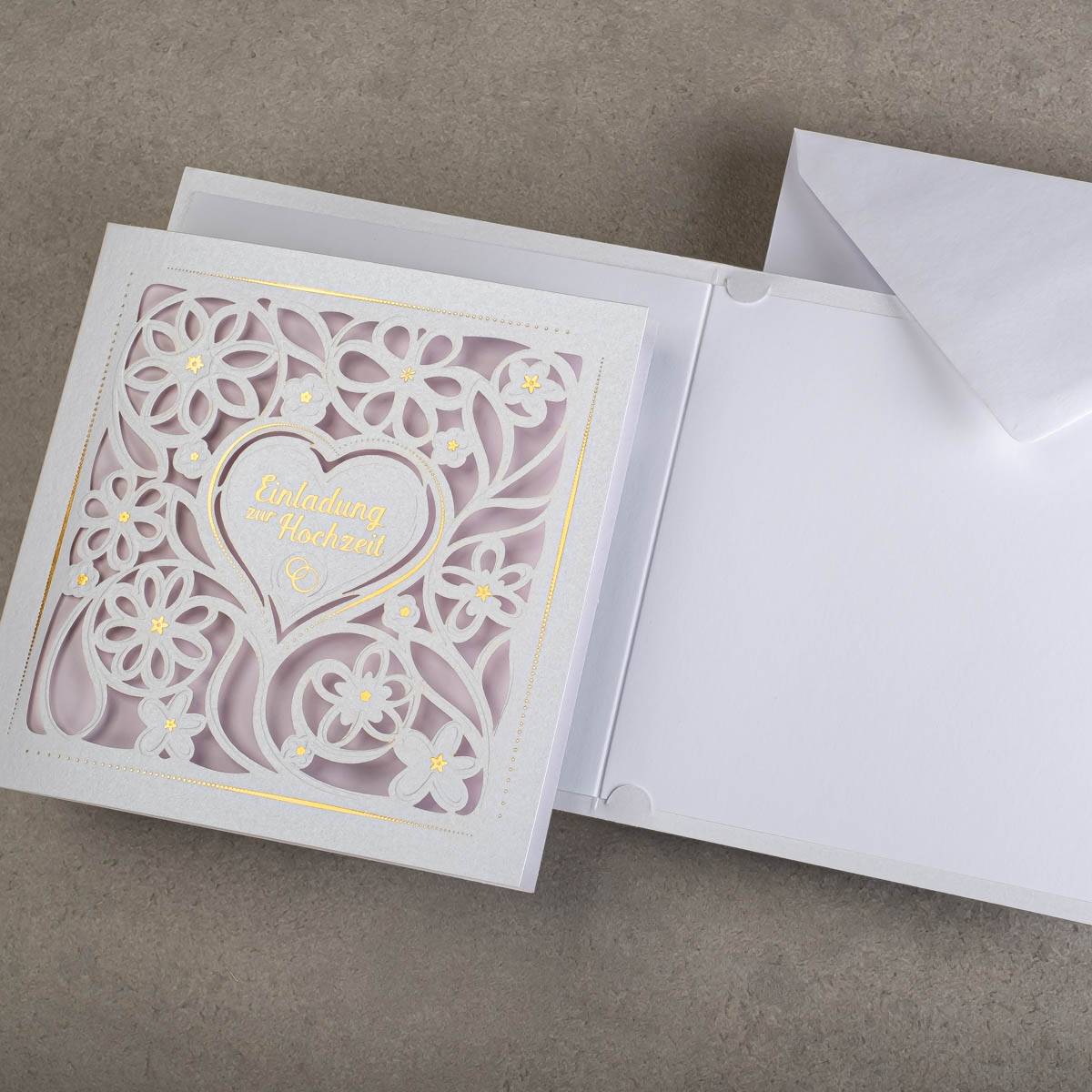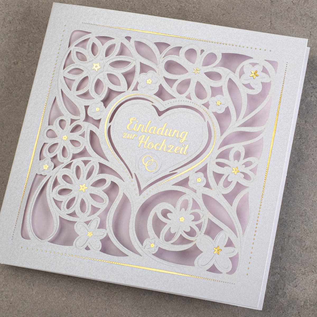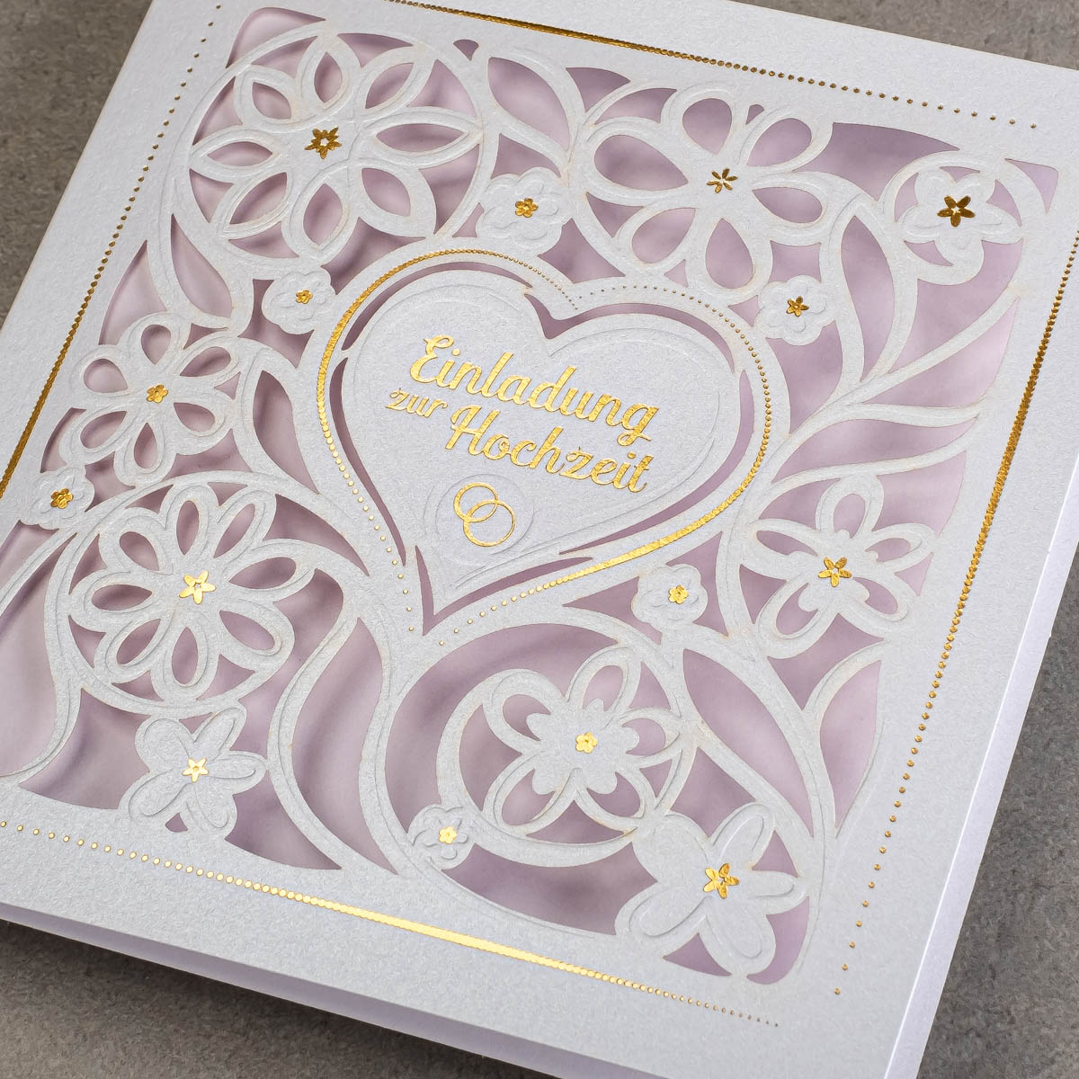 ART NUVO – HOCHZEITSEINLADUNGENSATZ ENTHÄLT: 20 St. Lasergeschnittene, mit Goldfolie veredelte, gepresste Einladungskarten, 22 St. Einlagen zum Bedrucken (wir legen zwei extra dazu), 20 blanke Umschläge