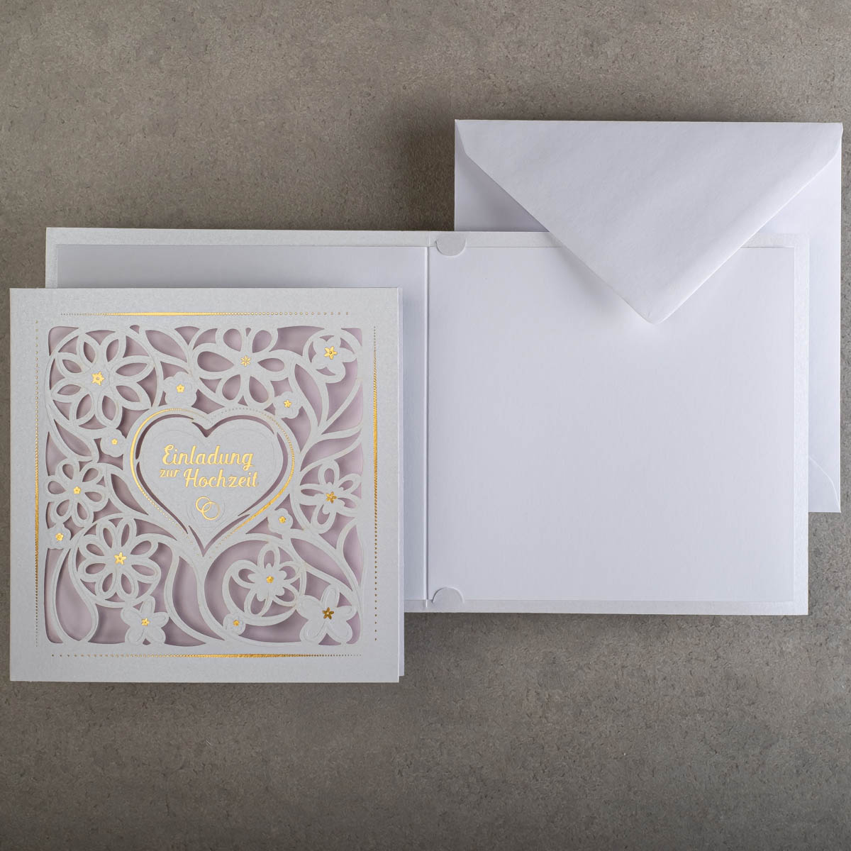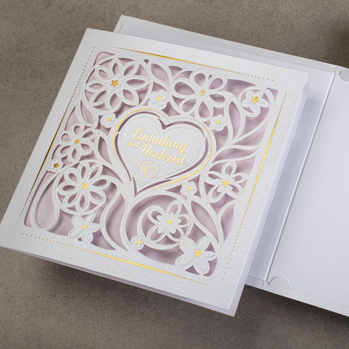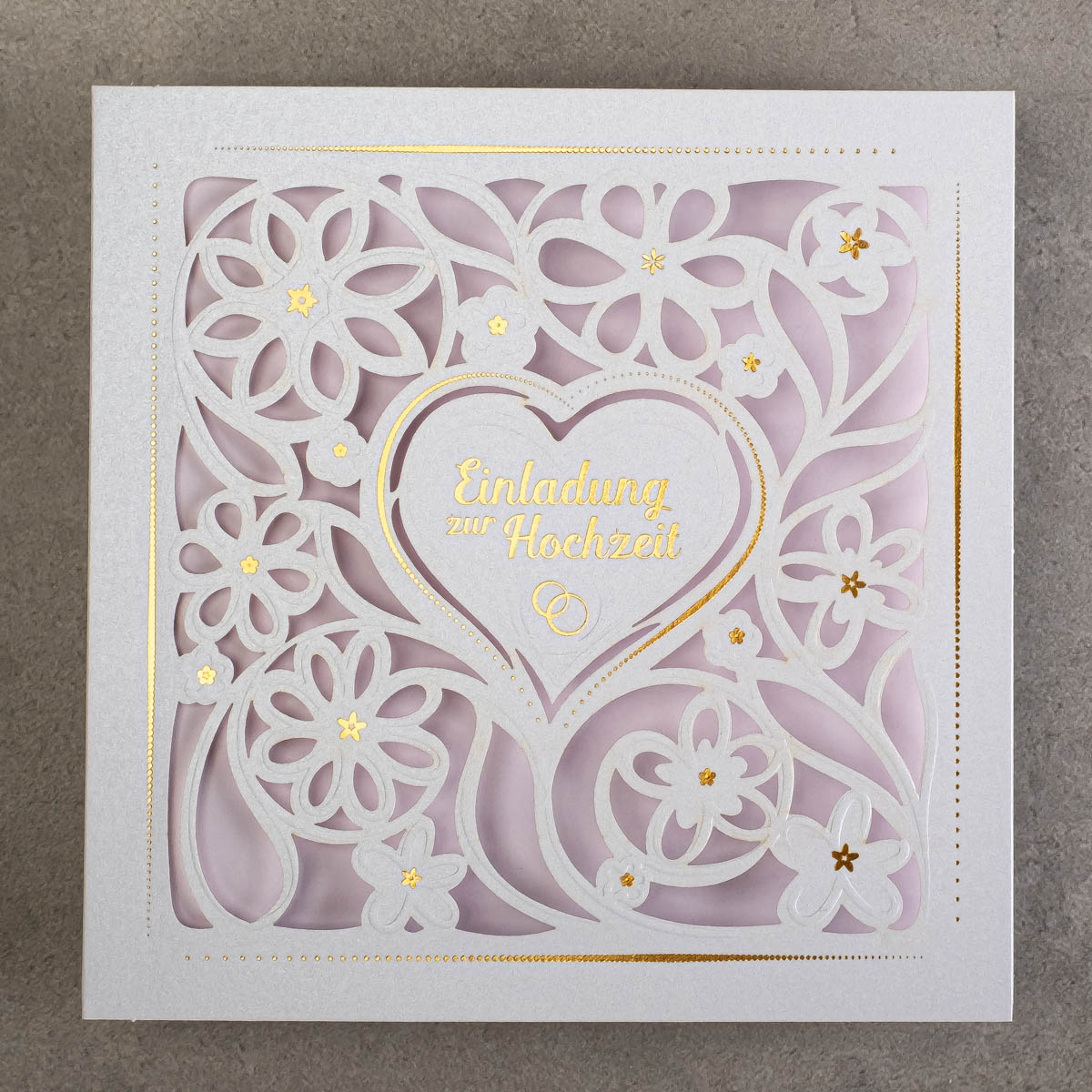 ART NUVO – HOCHZEITSEINLADUNGENSATZ ENTHÄLT: 20 St. Lasergeschnittene, mit Goldfolie veredelte, gepresste Einladungskarten, 22 St. Einlagen zum Bedrucken (wir legen zwei extra dazu), 20 blanke Umschläge