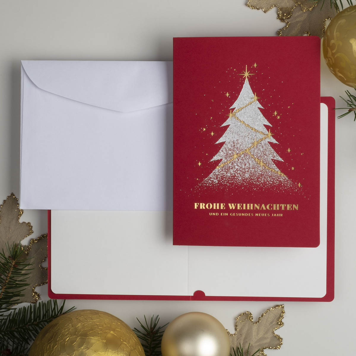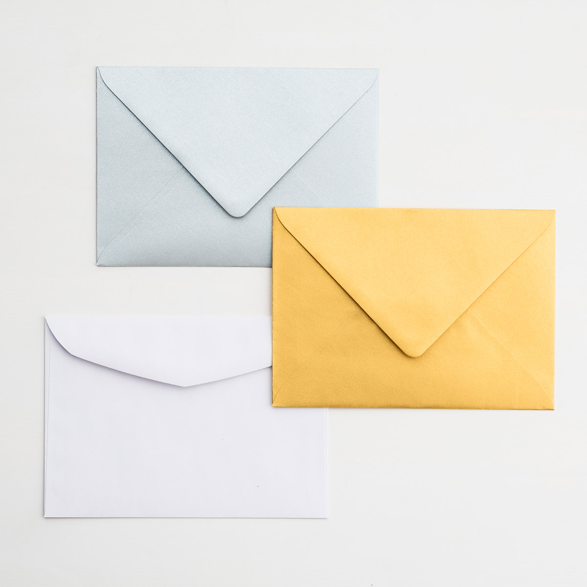 Weißer Umschlag nass geklebt ist im Kartenpreis enthalten. Darüber hinaus ist es möglich, einen weißen Umschlag mit Klebestreifen oder nass geklebt, Farbe gold oder silber.