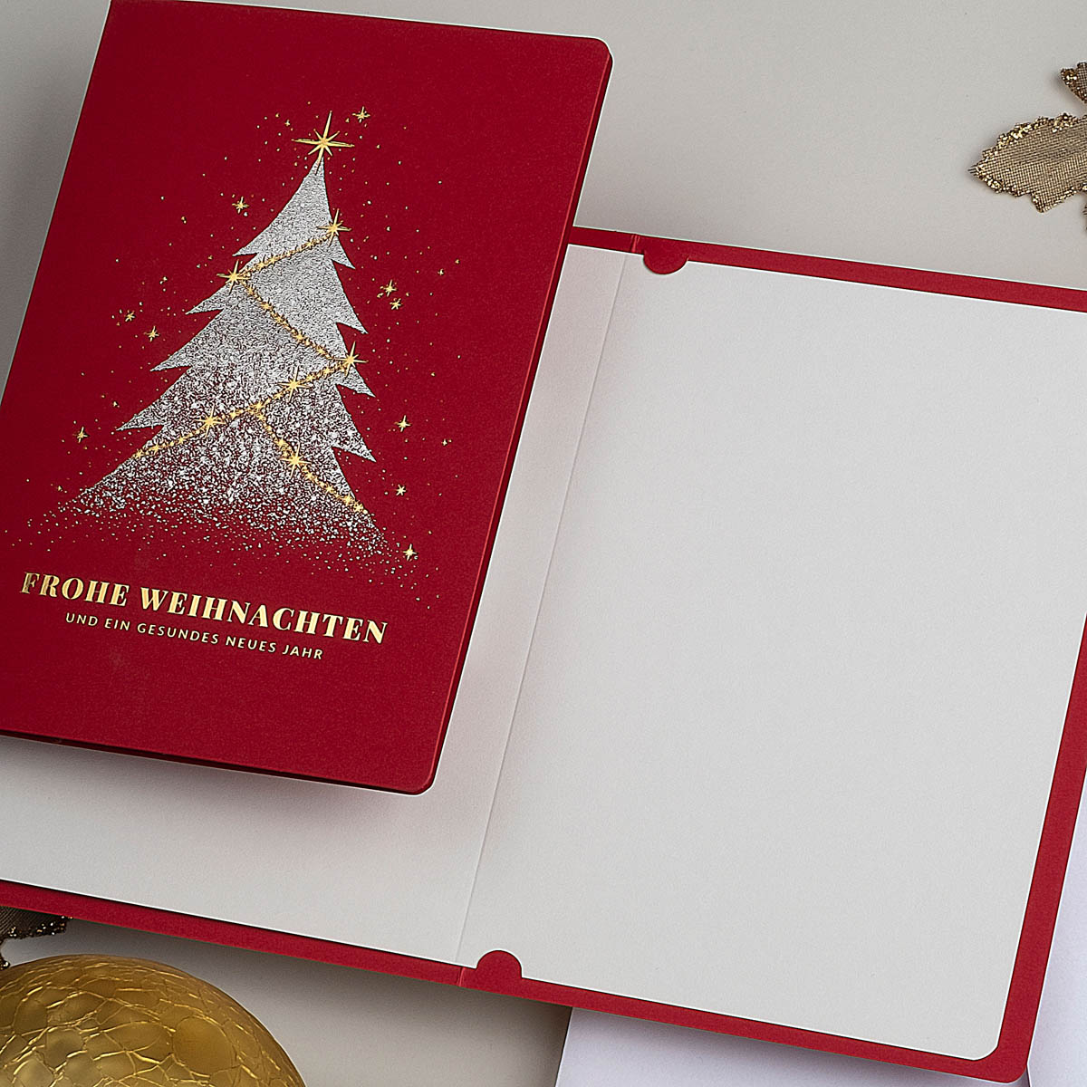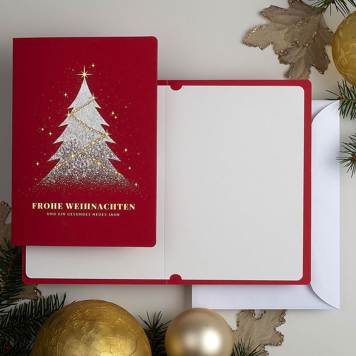LOGO UND WÜNSCHE – Sie können auf der Karte Ihr Firmenlogo in folgenden Techniken drucken lassen: Heißveredelung mit Metallfolie, Prägung oder Laserschneiden. Sie können Ihre Wünsche auf der Einlage mit digitalem Vollfarbdruck drucken lassen.